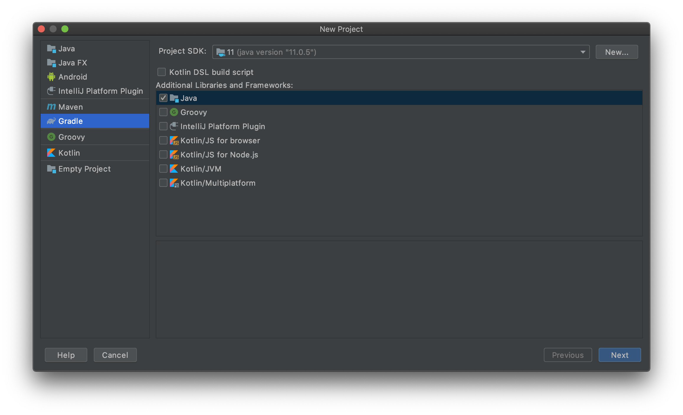 - Gradle을 선택하여 주고 Project SDK를 설정하고 Java를 선택하여 줍니다. Next...