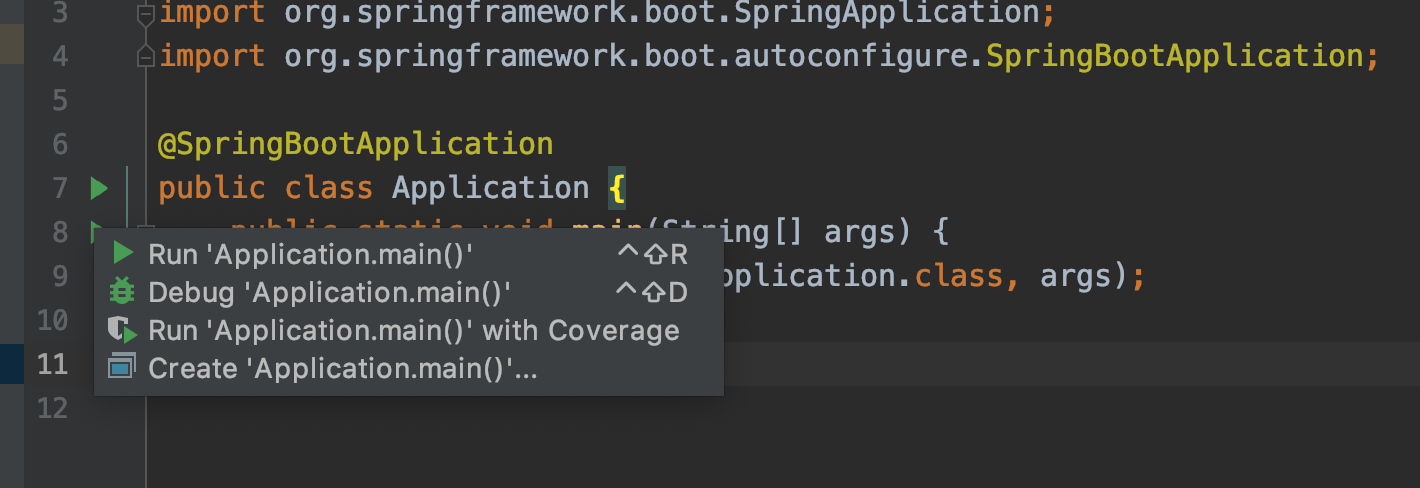 Application File에서 main method앞에 화살표를 누르면 다음과 같이 나오는데요. Run하면 끝납니다. 참쉽죠?