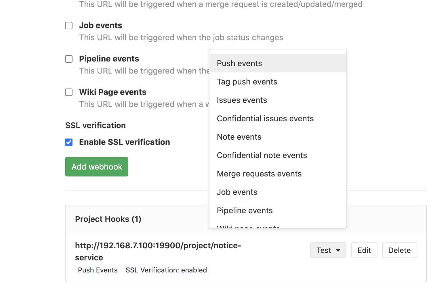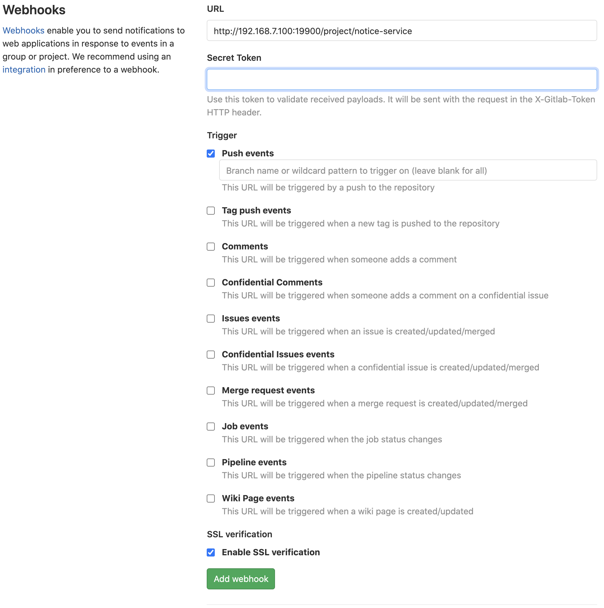 Push Events, Opened Merge Request Events, Approved Merge Requests, Comments를 체크합니다.