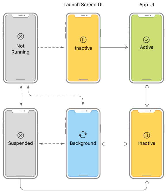 - 메모리가 부족한 상황이 오면 iOS system은 foreground에 있는 앱의 여유 메모리 공간 확보를 위해 이 상태에 있는 앱들을 특별한 알림없이 정리할 수도 있음. Not Running 상태가 됨.